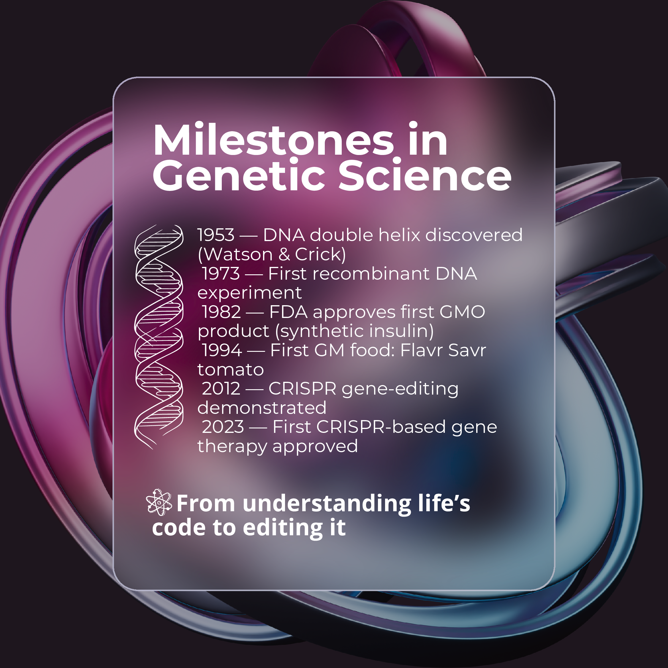 - 1973 – First DNA Recombinant: Researchers Cohen and Boyer combined DNA from different organisms, creating the first recombinant bacteria. This landmark experiment demonstrated that genes could be cut from one species and pasted into another, forming the basis of GMO technology.