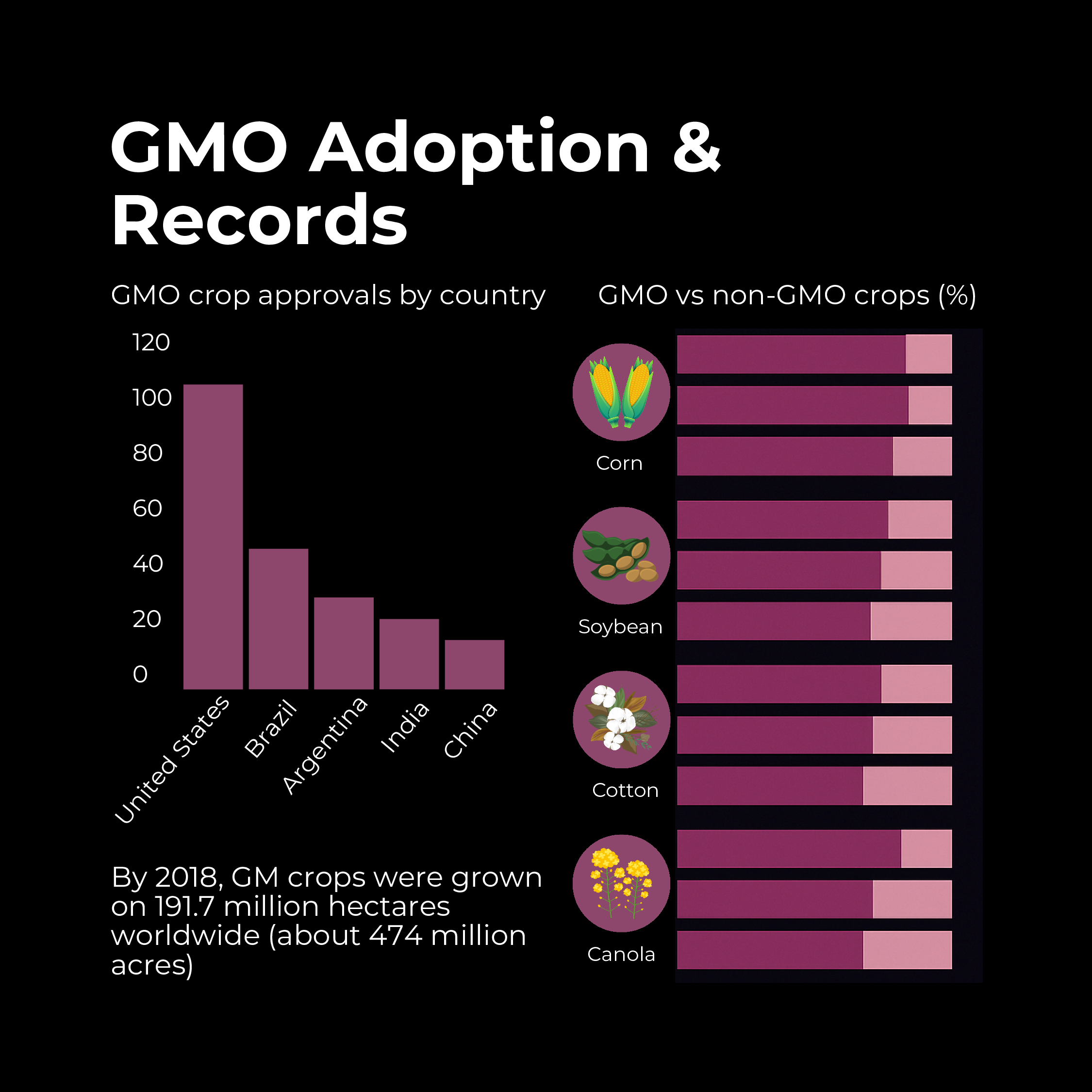 Since 1996, when GMO crop commercialization began, global adoption has surged. Farmers have found many GM varieties economically attractive due to improved pest control and yield stability. Some key global records and statistics include: