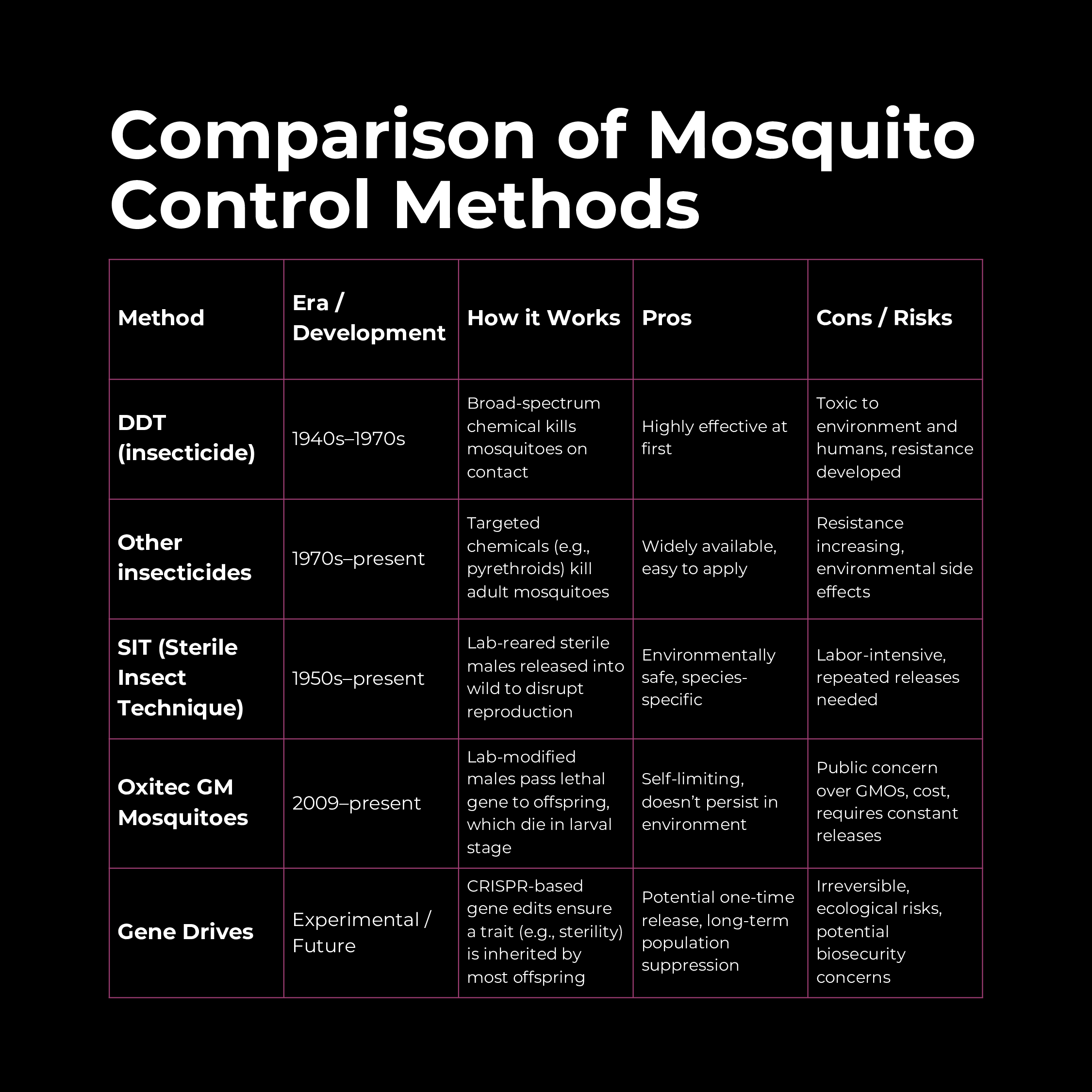 As DDT and similar chemicals waned, focus shifted to biological and genetic methods to control mosquitoes in safer, more targeted ways: